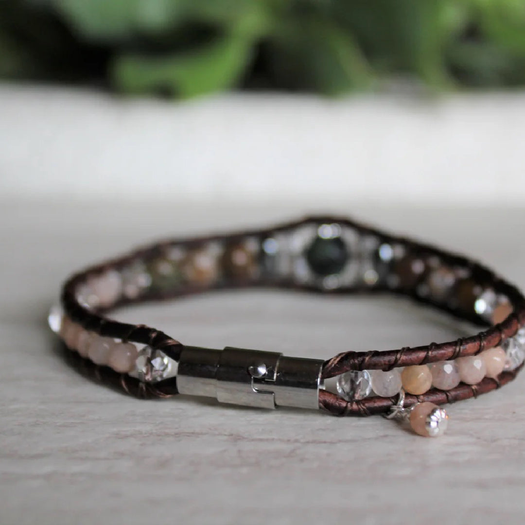- Handmade with antique brown genuine leather. This piece incorporates a gorgeous combination of gemstones, including Kambaba Jasper, African Green Opal, Clear Quartz, Hematite, and Sunstone.