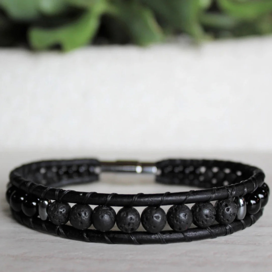 - Handmade with genuine leather, this bracelet features a combination of hematite, black onyx, and lava stone. From the core of the Earth, the lava stones can be used to diffuse any of your favorite essential oils.