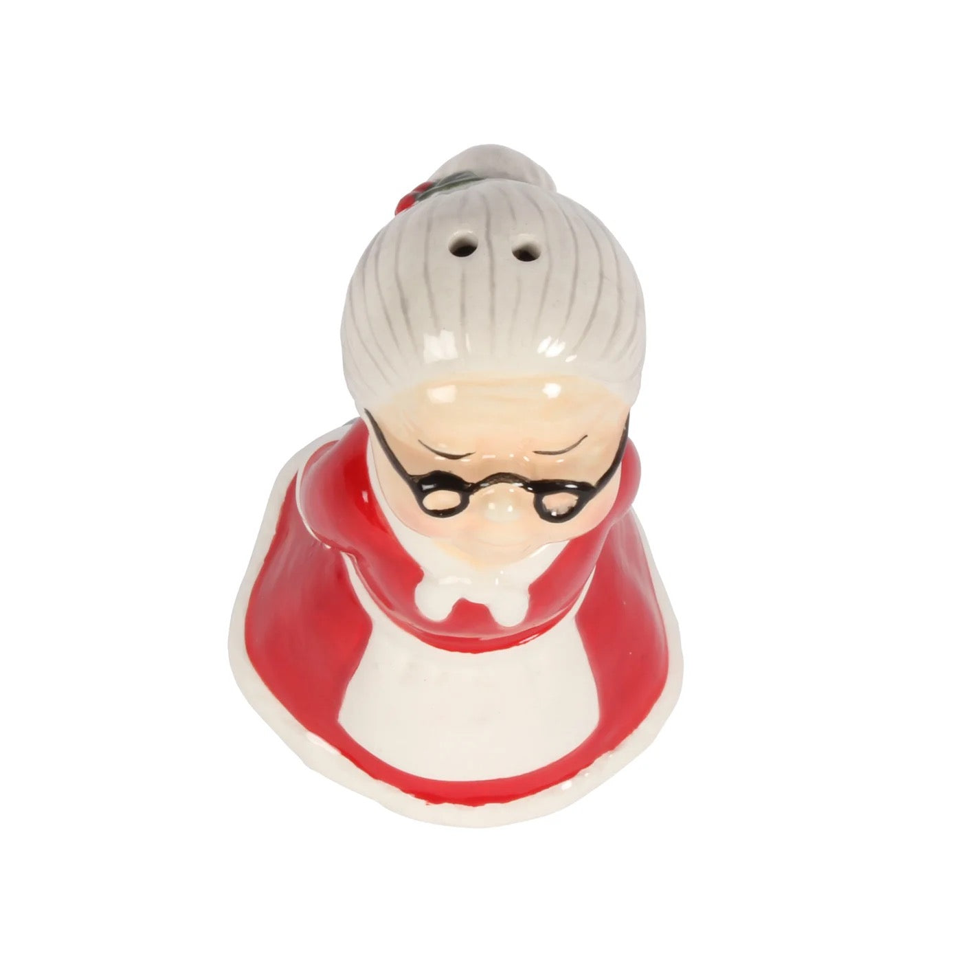 Vintage look Mr. + Mrs. Claus salt and pepper shaker set, featuring hand painted details.