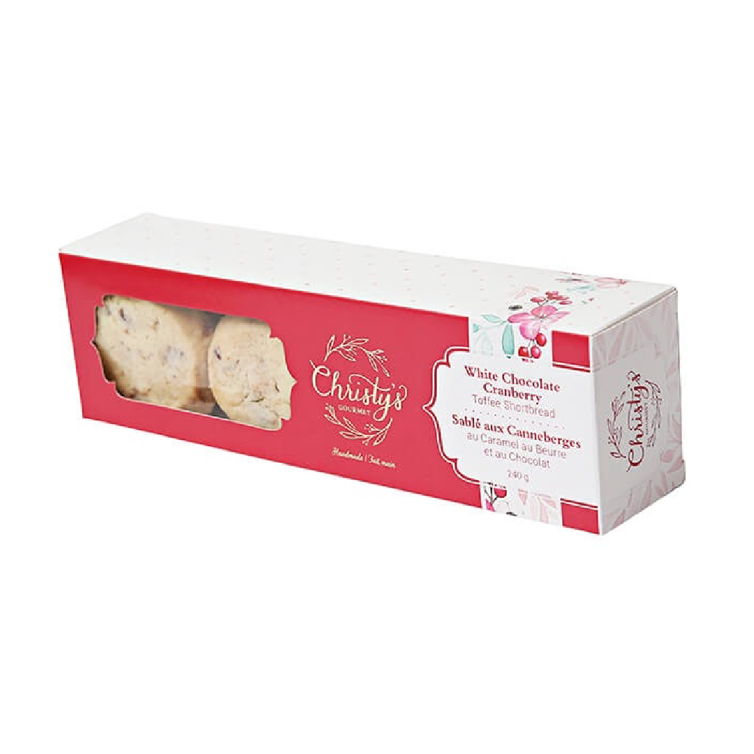 A light and fluffy all-butter shortbread, combined with our toffee, Belgian white chocolate chunks and cranberries.One Dozen Cookies Per Box.