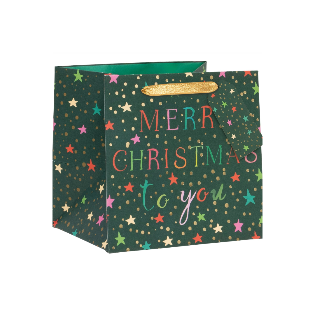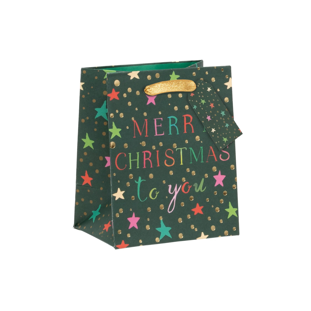Beautiful, high quality gift bag features festive stars and ribbon handles.