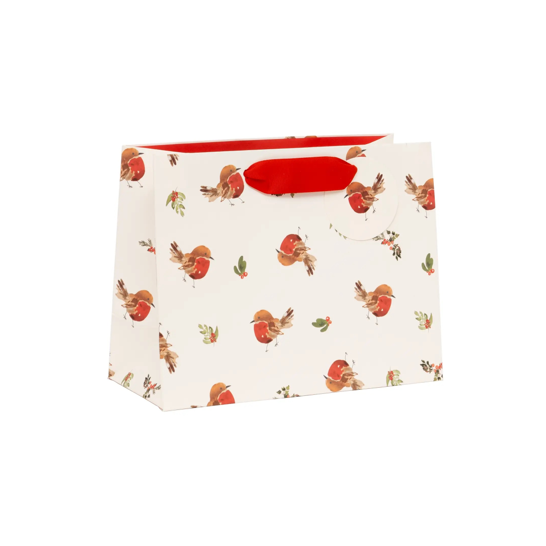 Beautiful, high quality gift bag features festive robins, hollies and ribbon handles.