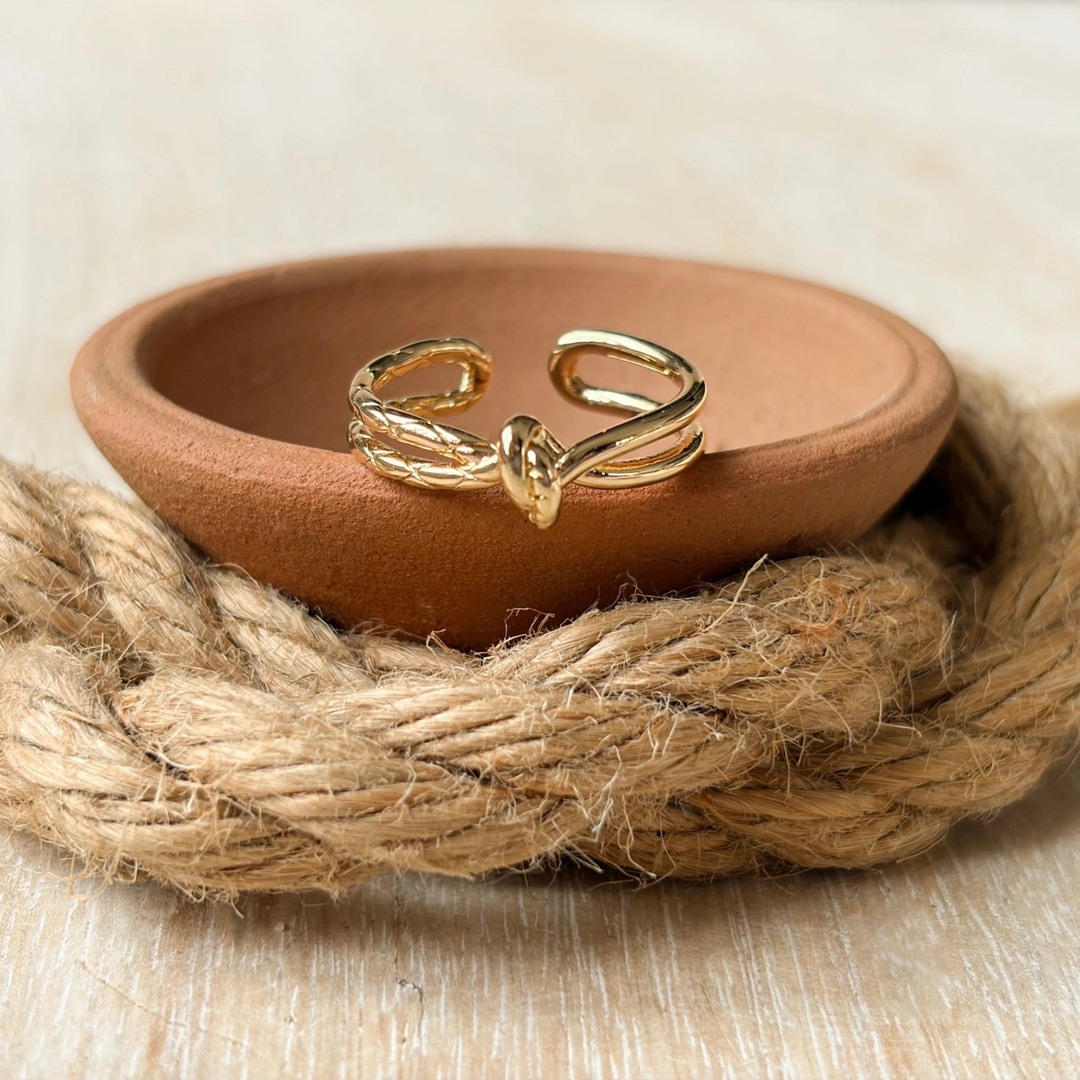 This adjustable ring features a knotted rope design inspired by classic western craftsmanship.