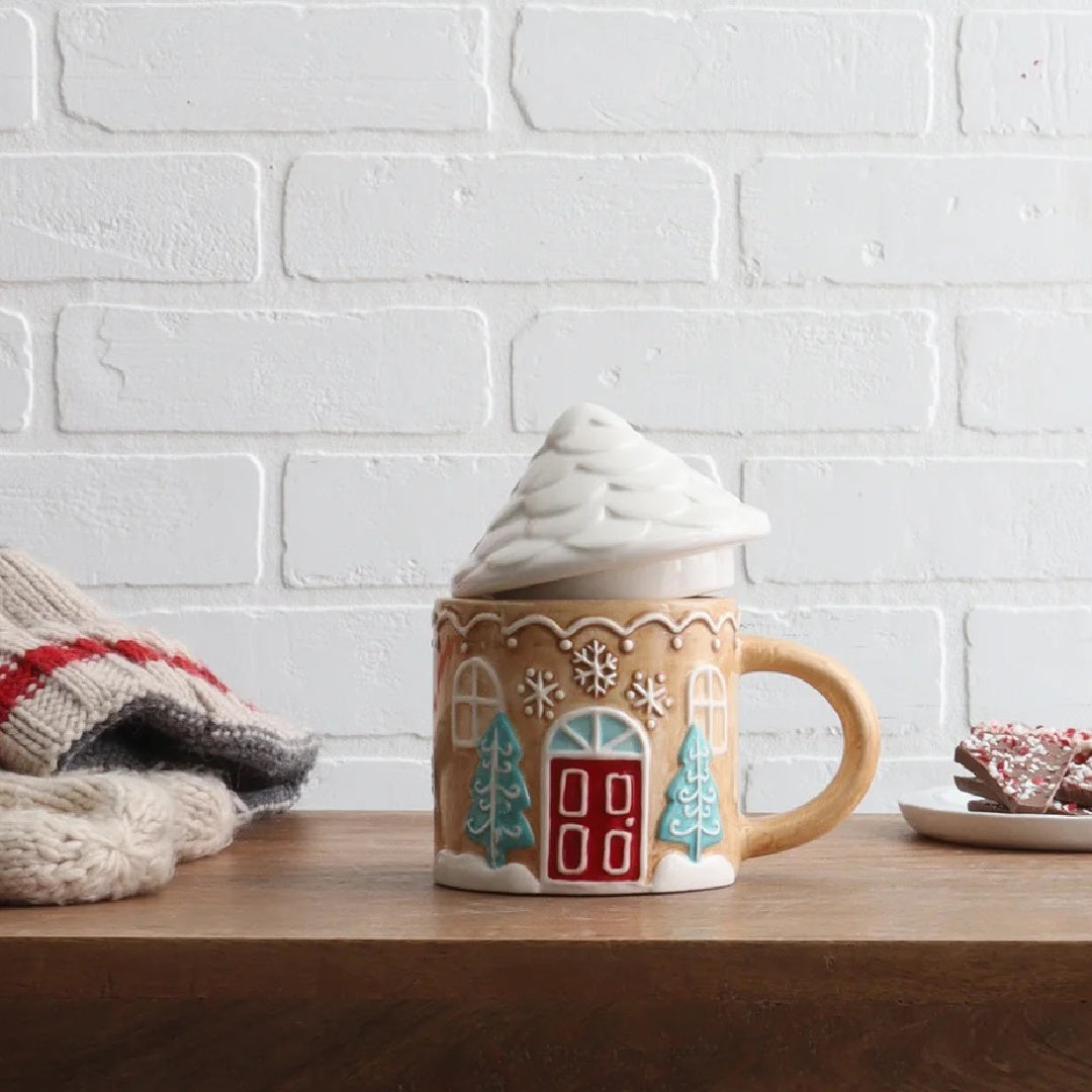 A unique, festive mug, featuring a lid to keep drinks warm.